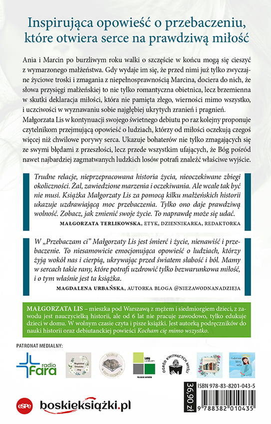 Trudne relacje, nieprzepracowana historia życia, nieoczekiwane zbiegi okoliczności. Żal, zawiedzione marzenia i oczekiwania. Ale wcale tak być nie musi. Książka Małgorzaty Lis za pomocą kilku małżeńskich historii ukazuje uzdrawiającą moc przebaczenia. Tylko ono daje prawdziwą wolność. Zobacz, jak zmienić swoje życie. To naprawdę może się udać.