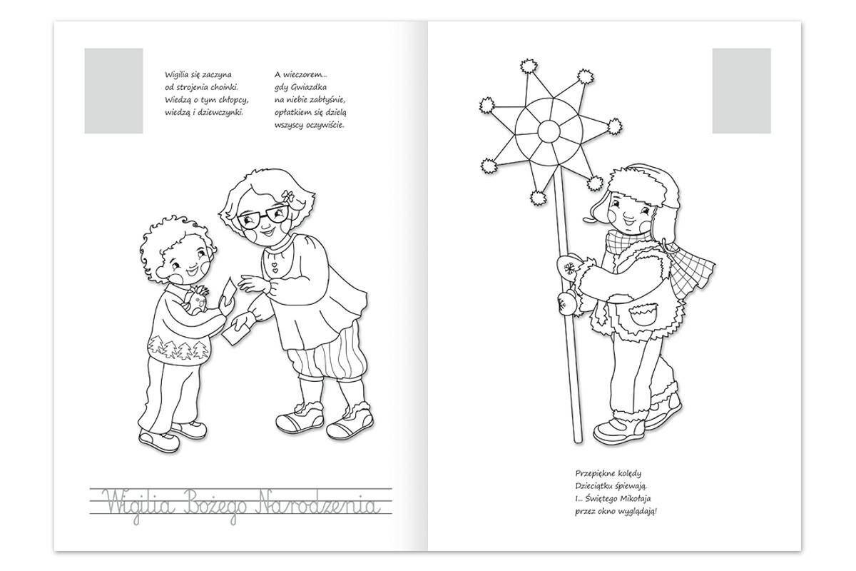 Ulubione świąteczne tradycje malucha - kolorowanka, to książka aktywizująca do kolorowania i nauki pisania. Każda strona zawiera duży obrazek z wyraźnym obrysem do pokolorowania oraz krótki tekst objaśniający tematykę zawartą w książce.