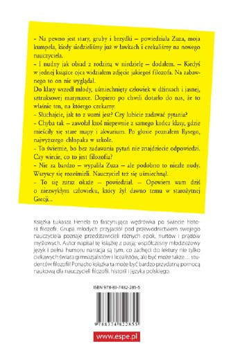 Książka Łukasza Henela to fascynująca wędrówka po świecie historii filozofii. Jej bohaterowie, grupa młodych przyjaciół, pod przewodnictwem swojego nauczyciela poznają przedstawicieli różnych epok, nurtówi prądów myślowych. Autor napisał tę książkę z pasją, posługując się współczesnym, młodzieżowym językiem i pełną humoru narracją. To doskonałe wprowadzenie do świata myśli i idei dla ciekawych świata gimnazjalistów i licealistów, a nawet studentów kierunków niefilozoficznych.Ponadto książka ta może być bardzo przydatną pomocą dydaktyczną dla nauczycieli filozofii, etyki, historii i języka polskiego.