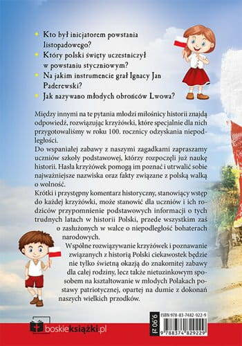 Do wspaniałej zabawy z naszymi zagadkami zapraszamy uczniów szkoły podstawowej, którzy rozpoczęli już naukę historii. Hasła krzyżówek pomogą im poznać i utrwalić sobie najważniejsze nazwiska oraz fakty związane z polską walką o wolność. Krótki i przystępny komentarz historyczny, stanowiący wstęp do każdej krzyżówki, może stanowić dla uczniów i ich rodziców przypomnienie podstawowych informacji o tych trudnych latach w historii Polski, przede wszystkim zaś o zasłużonych w walce o niepodległość bohaterach narodowych. Wspólne rozwiązywanie krzyżówek i poznawanie związanych z historią Polski ciekawostek będzie nie tylko świetną okazją do znakomitej zabawy dla całej rodziny, lecz także nietuzinkowym sposobem na kształtowanie w młodych Polakach postawy patriotycznej, opartej na dumie z dokonań naszych wielkich przodków.