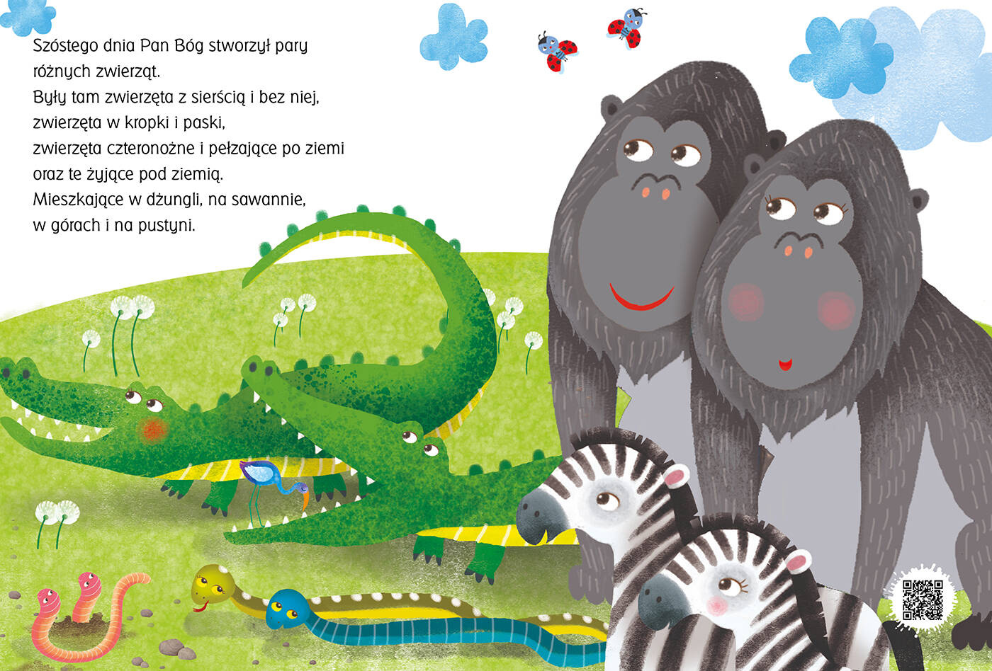 Ta śliczna kartonowa książka przedstawia najmłodszym czytelnikom biblijną historię stworzenia świata i zaprasza do przyjaźni z Panem Bogiem. 40 pięknych stron, a każda z nich przesycona czułością, kolorami i cudami, jakie Pan Bóg uczynił specjalnie dla nas. Pośród barwnych ilustracji znajdziemy także kody QR, dzięki którym usłyszymy kojące dźwięki i melodie napełniające serca radością.