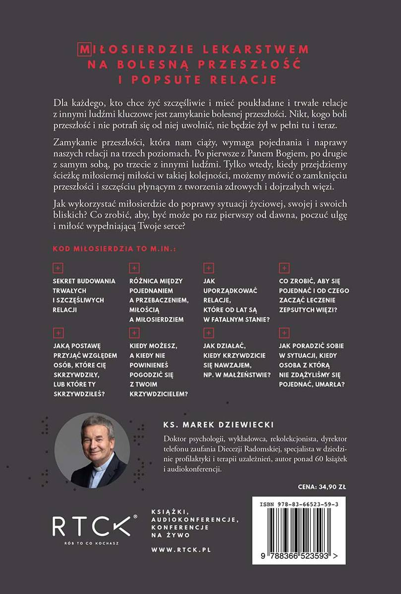 Dla każdego, kto chce żyć szczęśliwie i mieć poukładane i trwałe relacje z innymi ludźmi kluczowe jest zamykanie bolesnej przeszłości. Nikt, kogo boli przeszłość i nie potrafi się od niej uwolnić, nie będzie żył w pełni tu i teraz.Zamykanie przeszłości, która nam ciąży, wymaga pojednania i naprawy naszych relacji na trzech poziomach. Po pierwsze z Panem Bogiem, po drugie z samym sobą, po trzecie z innymi ludźmi. Tylko wtedy, kiedy przejdziemy ścieżkę miłosiernej miłości w takiej kolejności, możemy mówić o zamknięciu przeszłości i szczęściu płynącym z tworzenia zdrowych i dojrzałych więzi.Jak wykorzystać miłosierdzie do poprawy sytuacji życiowej, swojej i swoich bliskich? Co zrobić, aby, być może po raz pierwszy od dawna, poczuć ulgę i miłość wypełniającą Twoje serce?