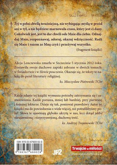 Alicja Lenczewska (1934–2012) to szczecińska mistyczka, która pozostawiła po sobie dwa dzienniki duchowe: “Świadectwo” i “Słowo pouczenia”, będące zapisem jej rozmów z Panem Jezusem, Bogiem Ojcem, Matką Bożą, archaniołami i świętymi. W tej książce znajdziesz wybrane fragmenty z jej dzienników.