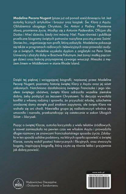Dzięki tej pięknej i wciągającej biografii, napisanej przez Madeline Pecorę Nuget, poznamy historię świętej Klary z Asyżu oraz jej sióstr zakonnych. Natchniona działalnością świętego Franciszka i jego ideałem świętego ubóstwa, święta Klara odrzuciła wszelkie ziemskie dobra, żeby podążyć za Jezusem Chrystusem. Ta decyzja wywołała konflikt z własną rodziną i sprawiła, że przyszłość młodej, szlachetnie urodzonej damy stanęła pod znakiem zapytania, ale święta Klara nie wahała się ani chwili. Niewielka grupa jej naśladowczyń wkrótce się umocniła i rozrosła, przekształcając się ostatecznie w zakon Ubogich Sióstr - klarysek.