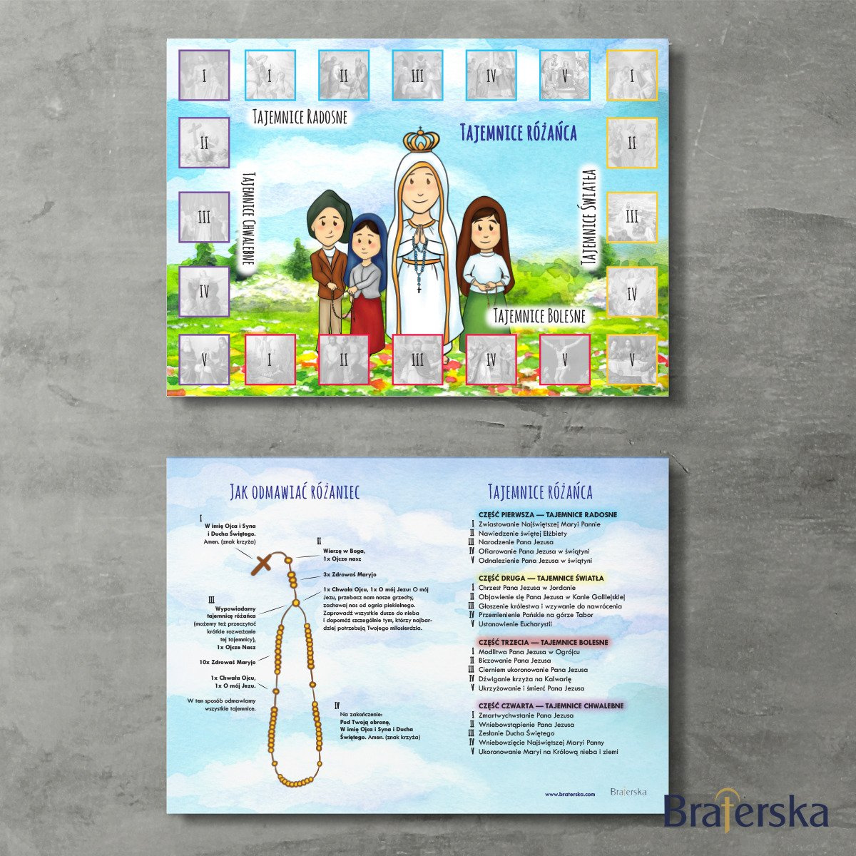 Kolorowe naklejki do wręczania dzieciom w czasie nabożeństw różańcowych pomogą zapamiętać tajemnice różańca, a barwna plansza pozwoli uporządkować zdobytą wiedzę na podstawie dopasowywania elementów. Do tego kontrolka wzbogacona jest o instrukcję odmawiania różańca oraz tajemnice różańcowe.