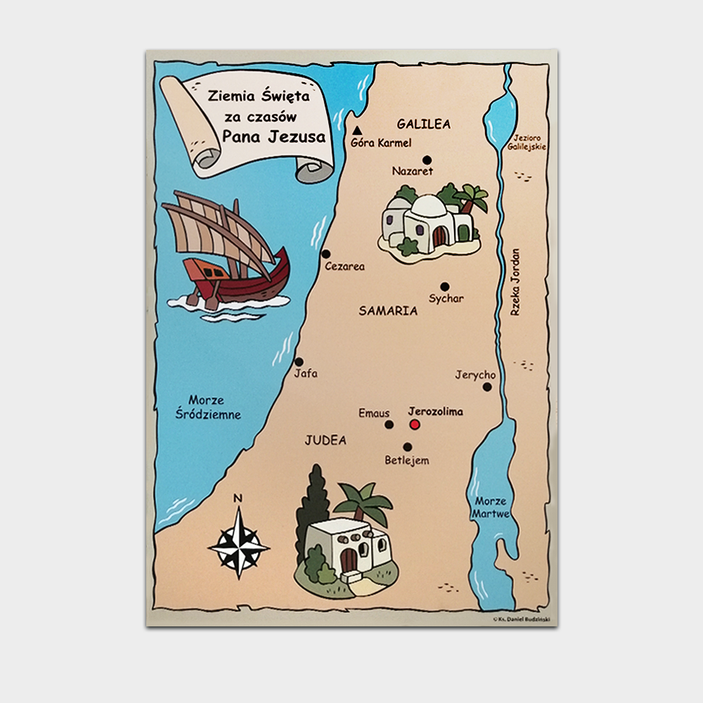 Tablica katechetyczna z mapą Ziemi Świętej za czasów Jezusa to doskonała pomoc dla katechetów na lekcję religii. Na jej podstawie można wytłumaczyć gdzie żył Jezus, jakie miasta odwiedzał, jakimi drogami chodził.