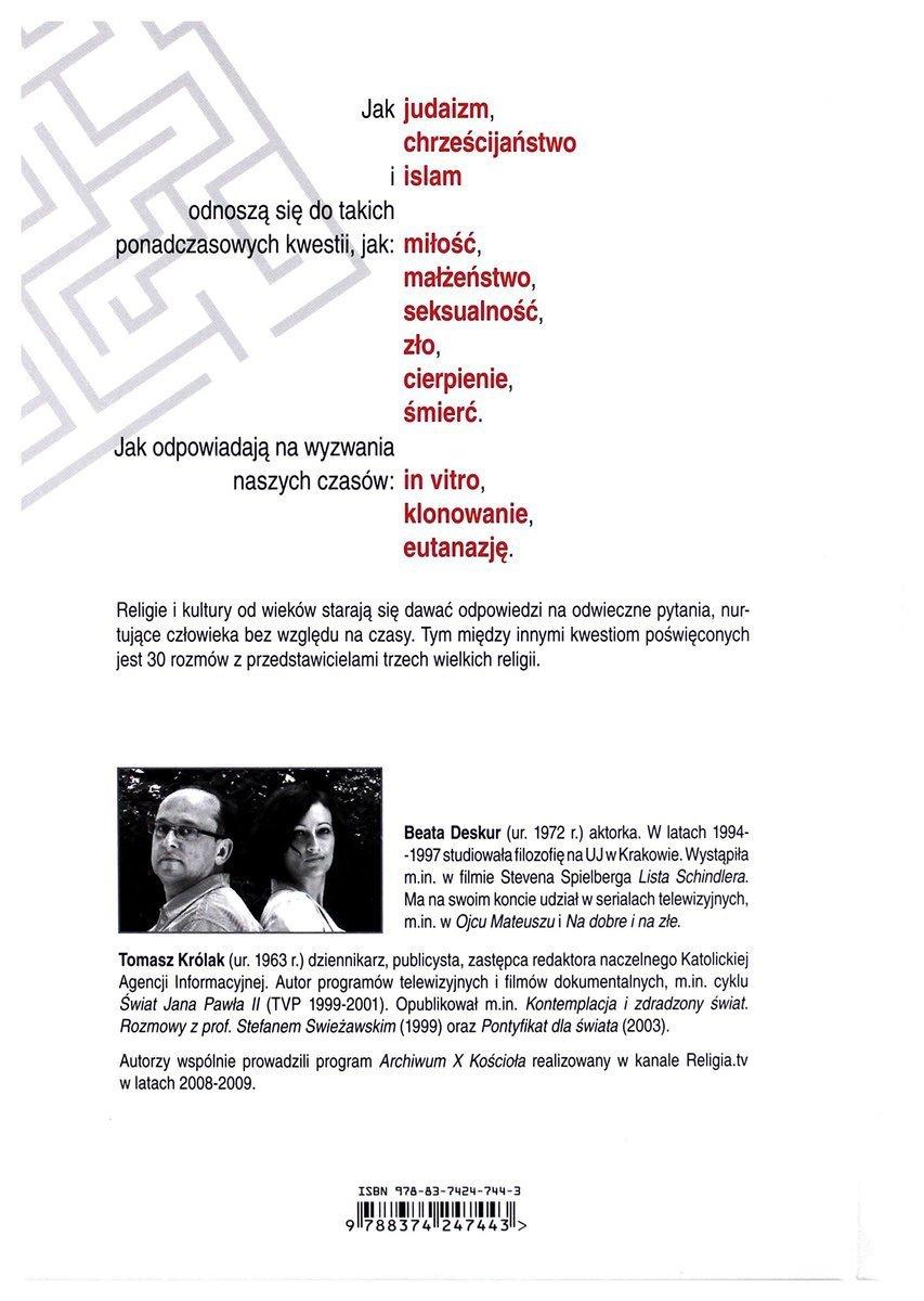 Czytelnik znajdzie odpowiedź m.in. na pytania: Jak judaizm, chrześcijaństwo i islam odnoszą się do takich ponadczasowych kwestii, jak: miłość, małżeństwo, seksualność, zło, cierpienie, śmierć? Jak odpowiadają na wyzwania naszych czasów: in vitro, klonowanie, eutanazję?