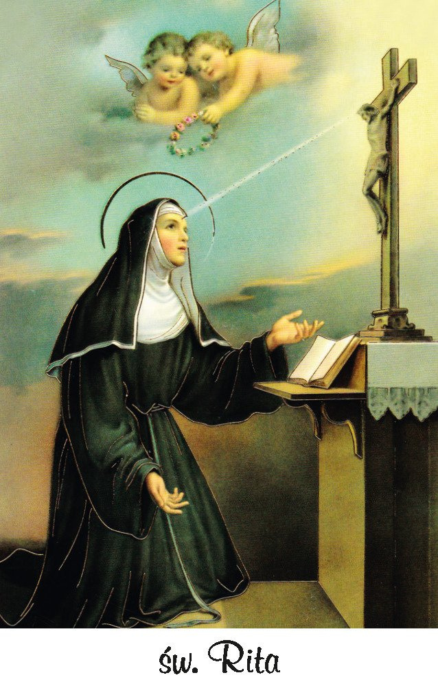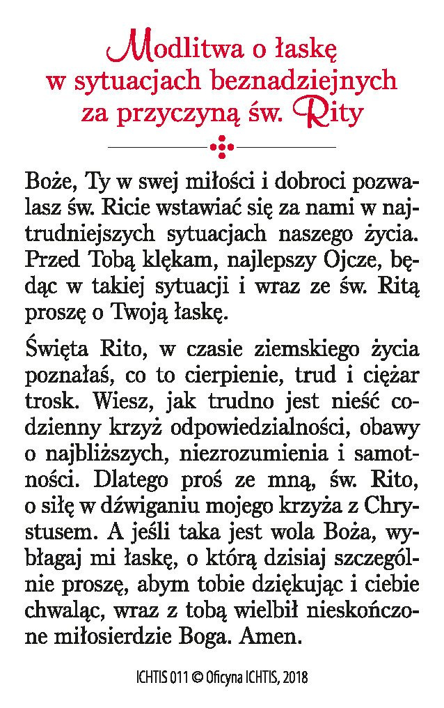 Na jednej stronie znajduje się wizerunek Świętej Rity, na drugiej modlitwa o łaskę w sytuacjach beznadziejnych do Świętej Rity.