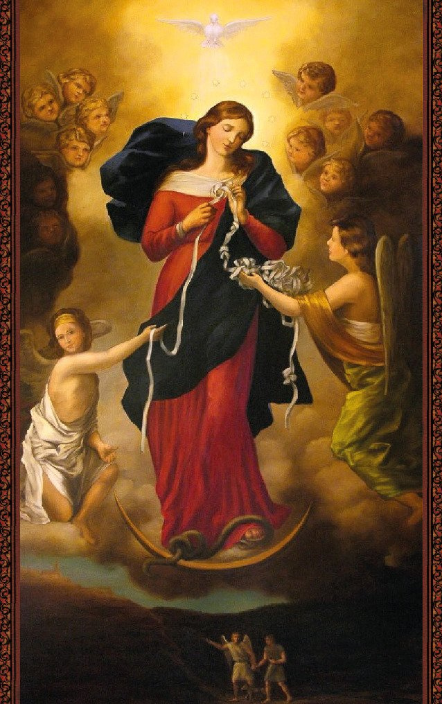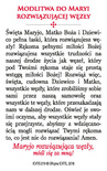 Na jednej stronie znajduje się wizerunek Matki Bożej Rozwiązującej Węzły, na drugiej modlitwa do Matki Bożej Rozwiązującej Węzły