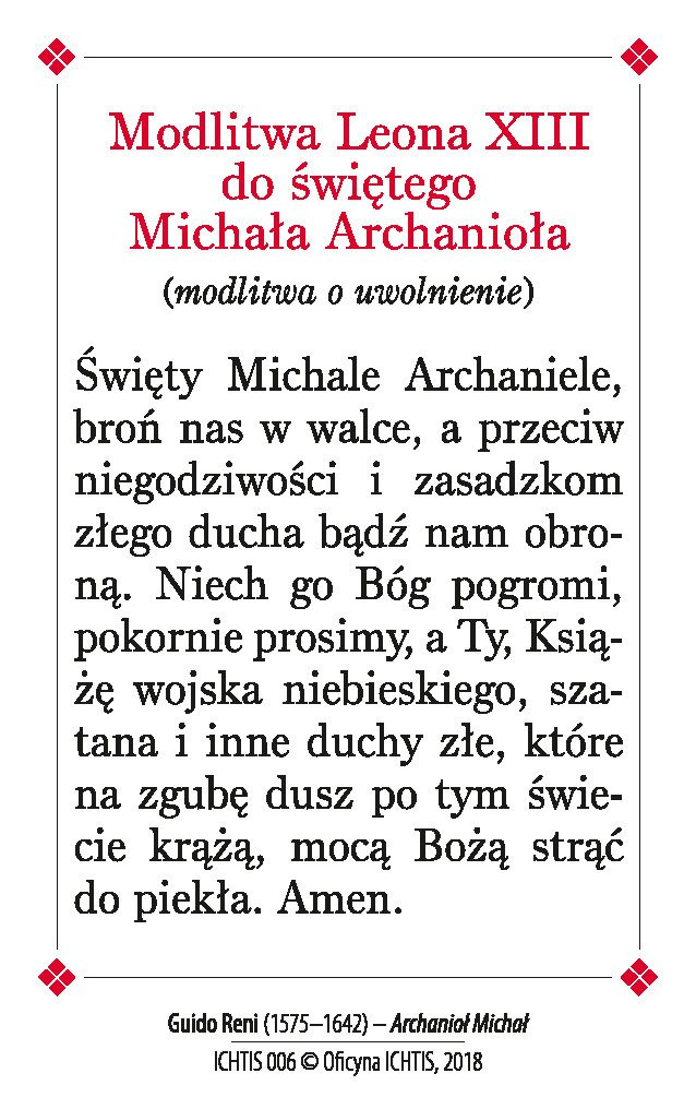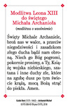 Na jednej stronie znajduje się wizerunek Świętego Michała Archanioła, na drugiej modlitwa Leona XIII do Świętego Michała Archanioła.