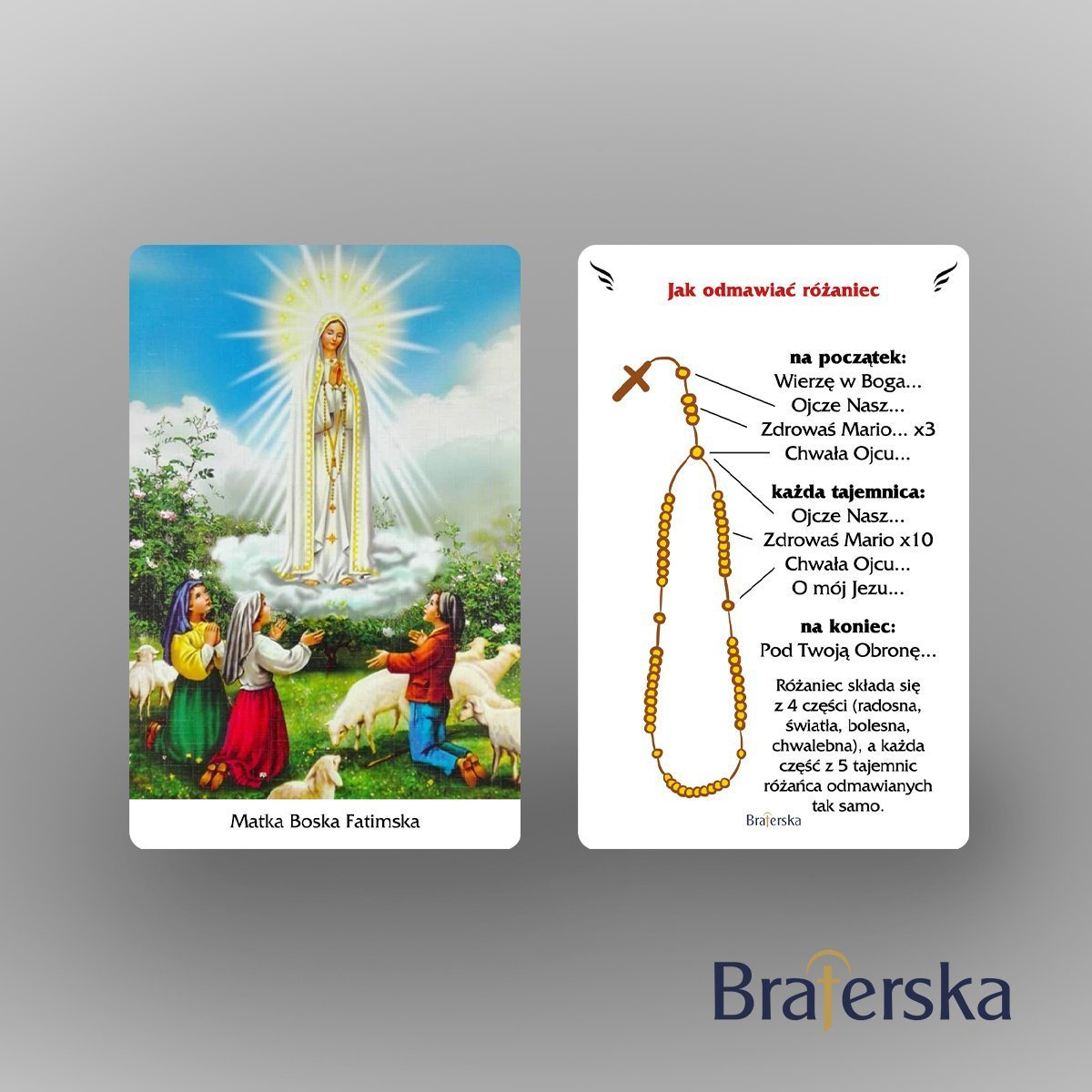Na pierwszej stronie wizerunek Maryi z dziećmi, na odwrocie instrukcja jak odmawiać różaniec.