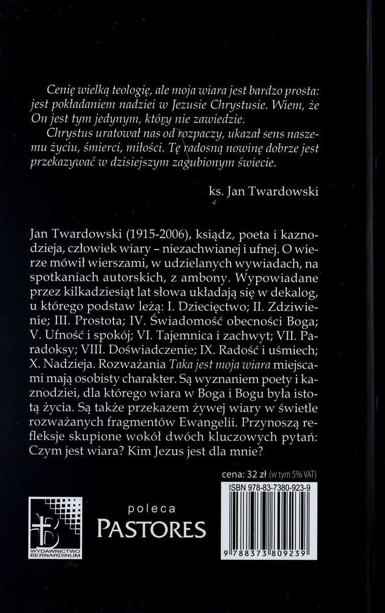Cenię wielką teologię, ale moja wiara jest bardzo prosta: jest pokładaniem nadziei w Jezusie Chrystusie. Wiem, że On jest tym jedynym, który nie zawiedzie. Chrystus uratował nas od rozpaczy, ukazał sens naszemu życiu, śmierci, miłości. Tę radosną nowinę dobrze jest przekazywać w dzisiejszym zagubionym świecie. ks. Jan Twardowski Jan Twardowski (1915-2006), ksiądz, poeta i kaznodzieja, człowiek wiary – niezachwianej i ufnej. O wierze mówił wierszami, w udzielanych wywiadach, na spotkaniach autorskich, z ambony. Wypowiadane przez kilkadziesiąt lat słowa układają się w dekalog, u którego podstaw leżą: I. Dziecięctwo; II. Zdziwienie; III. Prostota; IV. Świadomość obecności Boga; V. Ufność i spokój; VI. Tajemnica i zachwyt; VII. Paradoksy; VIII. Doświadczenie; IX. Radość i uśmiech; X. Nadzieja. Rozważania Taka jest moja wiara miejscami mają osobisty charakter. Są wyznaniem poety i kaznodziei, dla którego wiara w Boga i Bogu była istotą życia. Są także przekazem żywej wiary w świetle rozważanych fragmentów Ewangelii. Przynoszą refleksje skupione wokół dwóch kluczowych pytań: Czym jest wiara? Kim Jezus jest dla mnie?