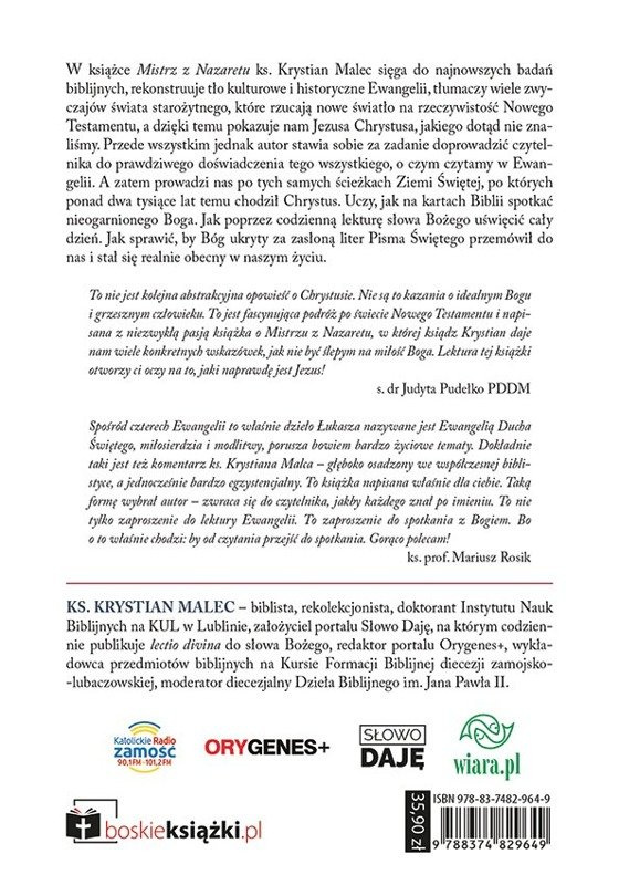 W książce Mistrz z Nazaretu ks. Krystian Malec sięga do najnowszych badań biblijnych, rekonstruuje tło kulturowe i historyczne Ewangelii, tłumaczy wiele zwyczajów świata starożytnego, które rzucają nowe światło na rzeczywistość Nowego Testamentu, a dzięki temu pokazuje nam Jezusa Chrystusa, jakiego dotąd nie znaliśmy. Przede wszystkim jednak autor stawia sobie za zadanie doprowadzić czytelnika do prawdziwego doświadczenia tego wszystkiego, o czym czytamy w Ewangelii. A zatem prowadzi nas po tych samych ścieżkach Ziemi Świętej, po których ponad dwa tysiące lat temu chodził Chrystus. Uczy, jak na kartach Biblii spotkać nieogarnionego Boga. Jak poprzez codzienną lekturę słowa Bożego uświęcić cały dzień. Jak sprawić, by Bóg ukryty za zasłoną liter Pisma Świętego przemówił do nas i stał się realnie obecny w naszym życiu.