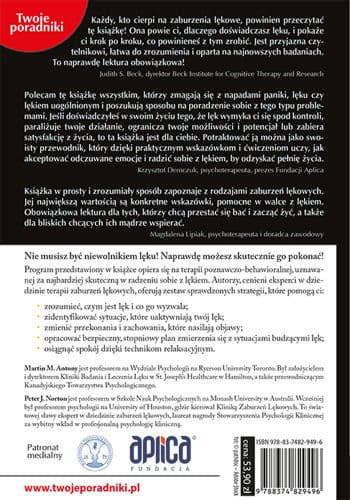 Polecam tę książkę wszystkim, którzy zmagają się z napadami paniki, lęku czy lękiem uogólnionym i poszukują sposobu na poradzenie sobie z tego typu problemami. Jeśli doświadczyłeś w swoim życiu tego, że lęk wymyka ci się spod kontroli, paraliżuje twoje działanie, ogranicza twoje możliwości i potencjał lub zabiera satysfakcję z życia, to ta książka jest dla ciebie. Potraktować ją można jako swoisty przewodnik, który dzięki praktycznym wskazówkom i ćwiczeniom uczy, jak akceptować odczuwane emocje i radzić sobie z lękiem, by odzyskać pełnię życia.