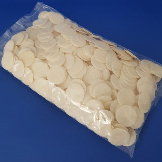 Komunikanty mszalne o średnicy 35 mm i grubości 1,7 mm z widocznym obustronnie wytłoczonym znakiem krzyża; wysoka jakość i zasklepione krawędzie wykluczają ich kruszenie.