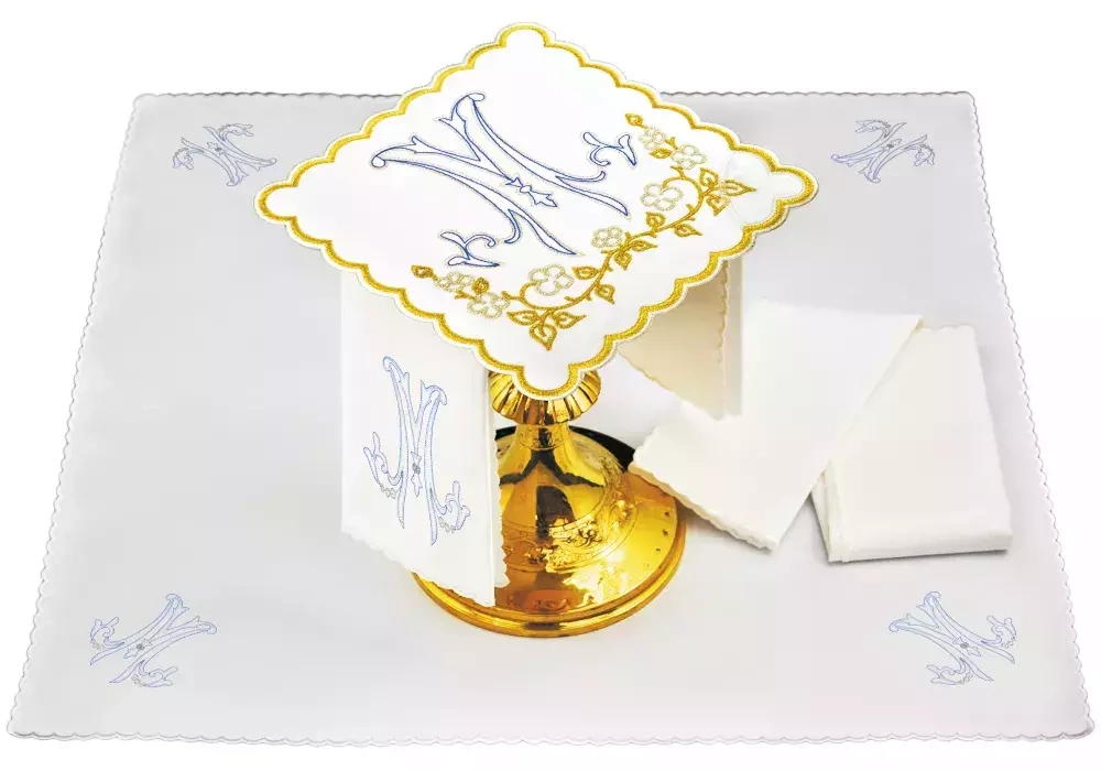 Bielizna kielichowa wykonana z wysokiej jakości tkaniny, zdobiona haftem z motywem maryjnym. Komplet składa się z czterech części: