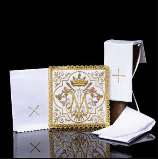 Wyjątkowy zestaw bielizny kielichowej wykonany z wysokiej jakości bawełnianej tkaniny, ozdobiony misternym haftem przedstawiającym symbol Maryjny. Złota korona, splecione liter „M” i „A” oraz otaczające je motywy winorośli i kłosów podkreślają królewską godność Matki Bożej i jej związek z Eucharystią.