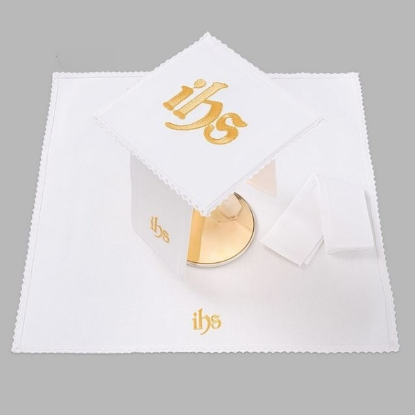 Bielizna kielichowa ołtarzowa wykończona koronką IHS złoty