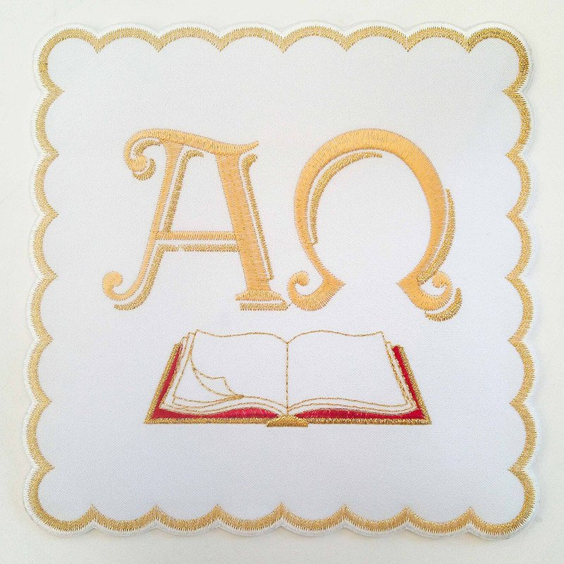Elegancka palka ołtarzowa, wykonana z wysokiej jakości tkaniny, zdobiona bogatym i symbolicznym haftem przedstawiającym otwartą Księgę, nad którą umieszczone są greckie litery Alfa (Α) i Omega (Ω). Ten wzór nawiązuje do Pisma Świętego jako Słowa Bożego oraz do Chrystusa, który jest Początkiem i Końcem wszystkiego (Apokalipsa św. Jana). Starannie wykonany haft podkreśla uroczysty charakter palki i jej głębokie znaczenie teologiczne.
