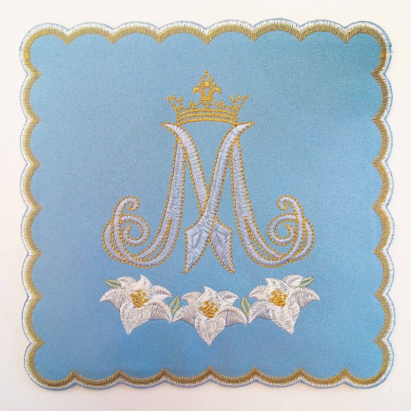 - Haft: Maryjny motyw (np. monogram Maryjny "M", gwiazdy, anioły) w połączeniu z niebieskimi liliami