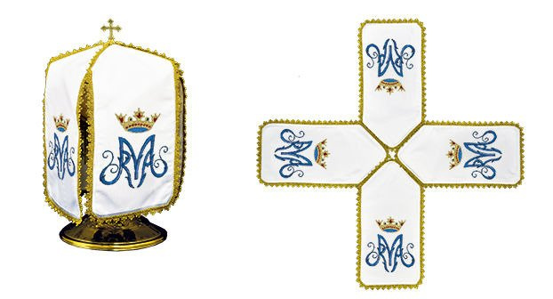 Welony na puszkę maryjny wykonany z tkaniny gładkiej, całość wykończona złotą koronką. Wysokość welonu: 24cm.