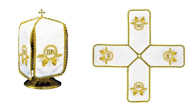 Welon na puszkę z haftowanym symbolem IHS, wykonany z tkaniny gładkiej, całość wykończona złotą koronką. Wysokość welonu: 24cm.
