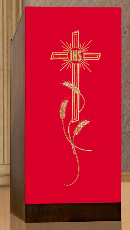 Serweta na lektorium haftowana z centralnie umieszczonym motywem krzyża i IHS. Produkt wykonany z wysokiej jakości tkaniny gładkiej. Dostępny we wszystkich kolorach liturgicznych.