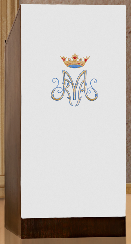 Serweta na lektorium haftowana z centralnie umieszczonym motywem maryjnym. Produkt wykonany z wysokiej jakości tkaniny gładkiej.