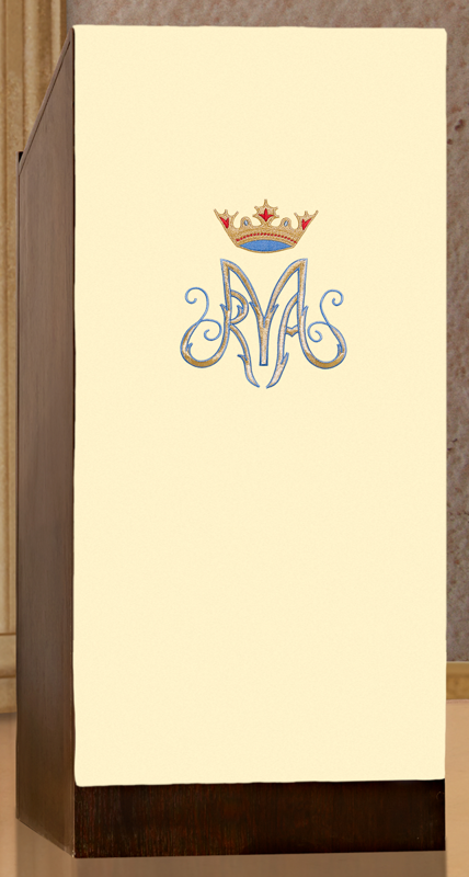 Serweta na lektorium haftowana z centralnie umieszczonym motywem maryjnym. Produkt wykonany z wysokiej jakości tkaniny gładkiej.