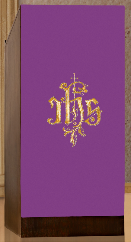 Serweta na lektorium haftowana z centralnie umieszczonym symbolem IHS. Produkt wykonany z wysokiej jakości tkaniny gładkiej.