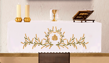 Obrus ołtarzowy z haftem czołowym wykonany z wysokiej jakości tkaniny plamoodpornej. Haft umieszczony w przedniej części obrusu, brzeg wykończony delikatnym haftem baratto.