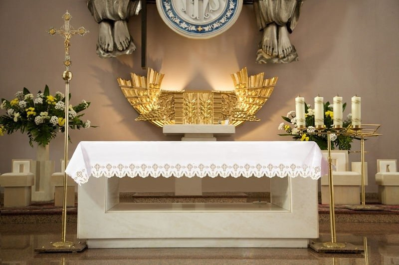 Obrus ołtarzowy z haftem czołowym wykonany z wysokiej jakości tkaniny plamoodpornej. Haft umieszczony w przedniej części obrusu, brzeg wykończony delikatnym haftem baratto.