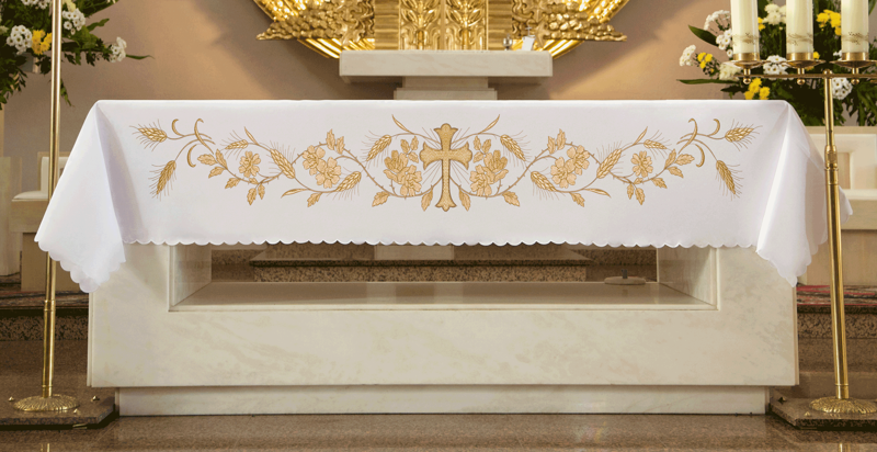 • Obrus ołtarzowy z haftem czołowym wykonany z wysokiej jakości poliestrowej tkaniny plamoodpornej. KOH/022