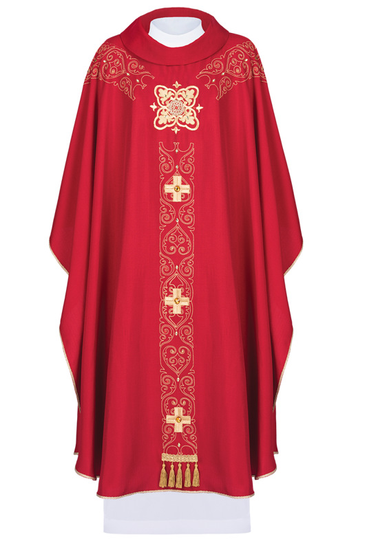 Ornat wykonany z bardzo wysokiej jakości tkaniny gładkiej. Szata haftowana na planie krzyża, wykończona złotymi frędzlami i udekorowana kamieniami fasetowanymi. Całość wykończona lamówką w kolorze ornatu. Stuła wewnętrzna w komplecie.