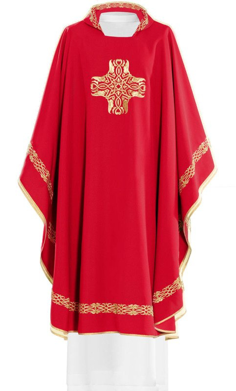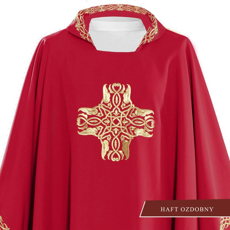 Ornat wykonany z wysokiej jakości tkaniny gładkiej, zdobiony haftowanym symbolem Krzyża. Całość wykończona złoto-satynową lamówką. Dostępny we wszystkich kolorach liturgicznych.