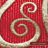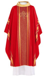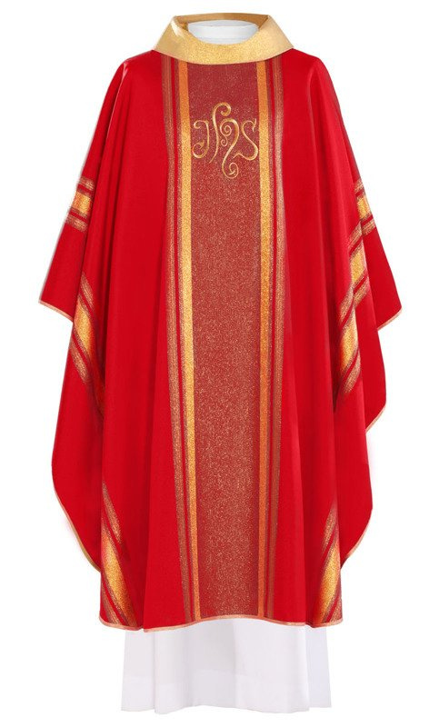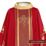 Ornat wykonany z wysokiej jakości tkaniny z ozdobnymi metalizowanymi włóknami. Szata ozdobiona haftem symbol IHS . Całość wykończona złoto-satynową lamówką. Dostępny we wszystkich kolorach liturgicznych.