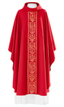 Ornat wykonany z wysokiej jakości tkaniny gładkiej, zdobiony pasem haftowanym. Całość wykończona złoto-satynową lamówką. Dostępny we wszystkich kolorach liturgicznych.