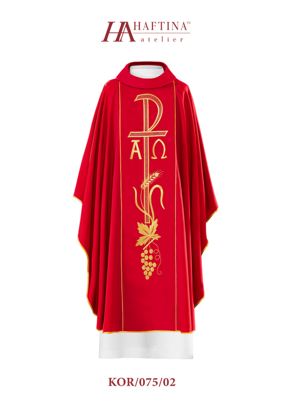 • Czerwony ornat z haftem Alfa i Omega na pasie