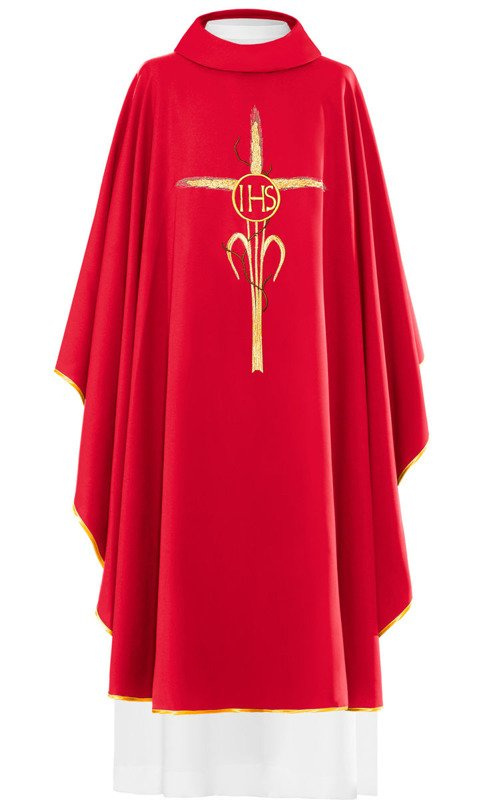 Ornat wykonany z wysokiej jakości tkaniny gładkiej, zdobiony  pasem z haftowanym symbolem IHS. Całość wykończona złoto-satynową lamówką. Dostępny we wszystkich kolorach liturgicznych.