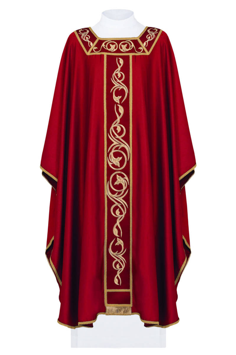 Ornat wykonany z wysokiej jakości tkaniny gładkiej, zdobiony bogatym haftem. Całość wykończona złoto-satynową lamówką.