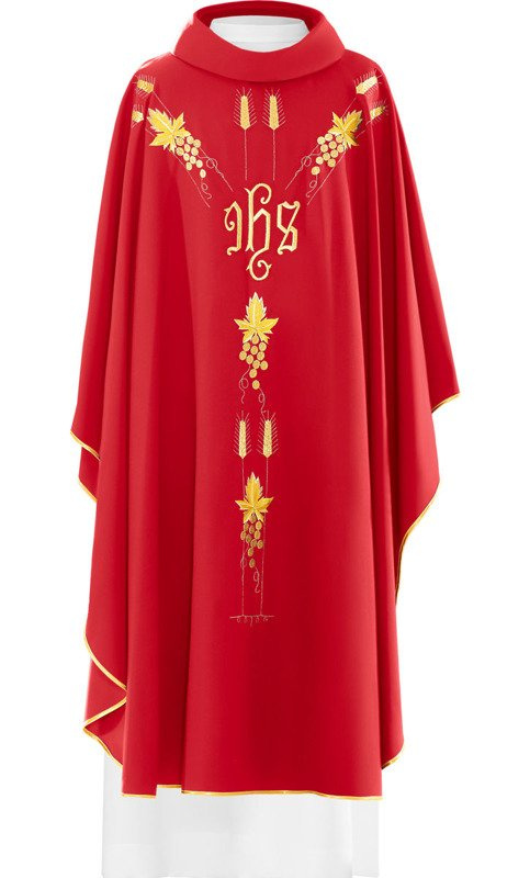 Ornat wykonany z wysokiej jakości tkaniny gładkiej, zdobiony symbolem IHS, tył ornatu zdobiony symbolem krzyża. Całość wykończona złoto-satynową lamówką. Dostępny we wszystkich kolorach liturgicznych.