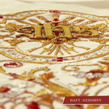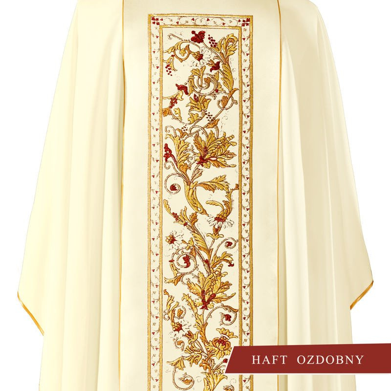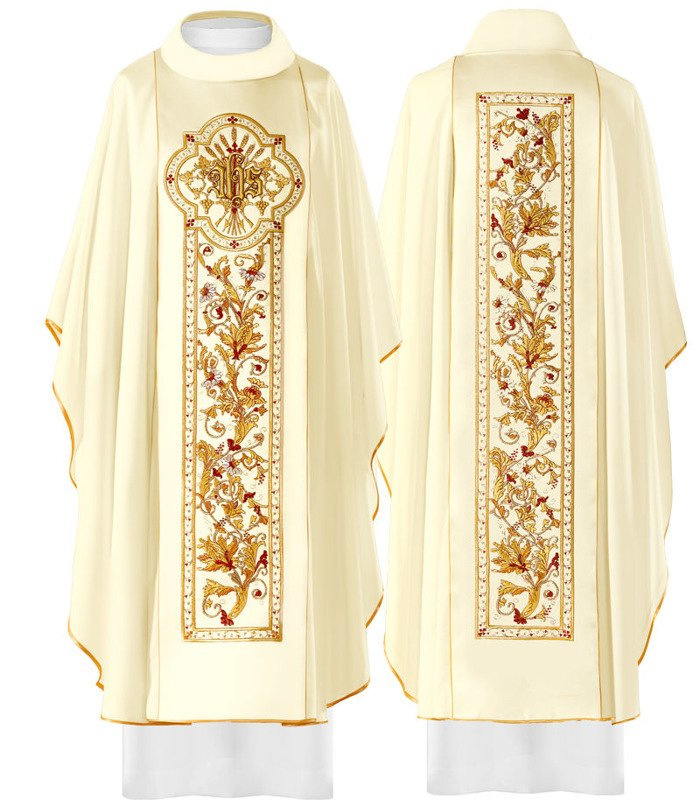 Ornat wykonany z wysokiej jakości tkaniny gładkiej, zdobiony pasem z haftowanym symbolem IHS. Całość wykończona złoto-satynową lamówką. Dostępny na zamówienie we wszystkich kolorach liturgicznych.