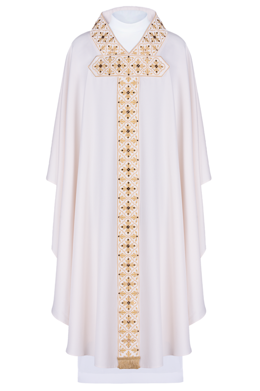 Ornat wykonany z bardzo wysokiej jakości tkaniny gładkiej. Szata z bogato haftowanym pasem i kołnierzem z motywem krzyża i udekorowana kamieniami fasetowanymi. Całość wykończona lamówką w kolorze ornatu. Stuła wewnętrzna w komplecie.