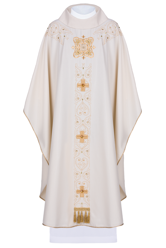 Ornat wykonany z bardzo wysokiej jakości tkaniny gładkiej. Szata haftowana na planie krzyża, wykończona złotymi frędzlami i udekorowana kamieniami fasetowanymi. Całość wykończona lamówką w kolorze ornatu. Stuła wewnętrzna w komplecie.
