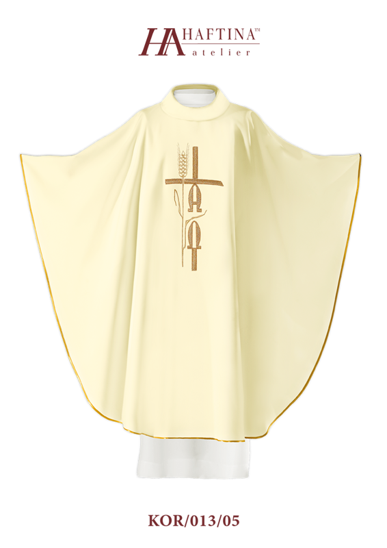 Ornat wykonany z wysokiej jakości tkaniny gładkiej, zdobiony bogatym haftem z symbolami liturgicznymi. Całość wykończona złoto-satynową lamówką. Dostępny we wszystkich kolorach liturgicznych.