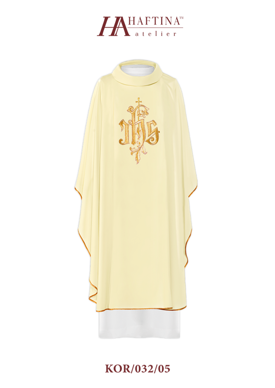 Ornat wykonany z wysokiej jakości tkaniny gładkiej, zdobiony bogatym haftem z symbolem IHS. Całość wykończona złoto-satynową lamówką. Dostępny we wszystkich kolorach liturgicznych.