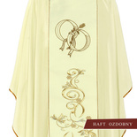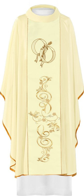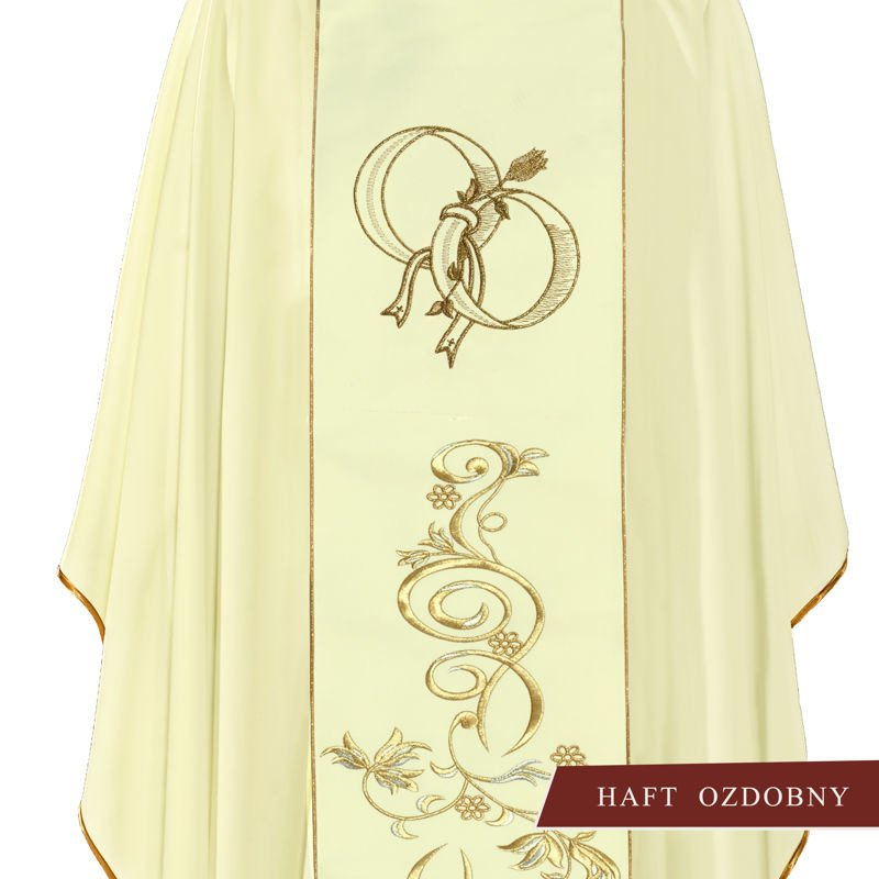 Ornat wykonany z wysokiej jakości tkaniny gładkiej, zdobiony pasem z haftowanym z motywem obrączek ślubnych. Całość wykończona złoto-satynową lamówką. Dostępny w kolorze Ecru i Białym