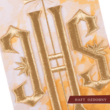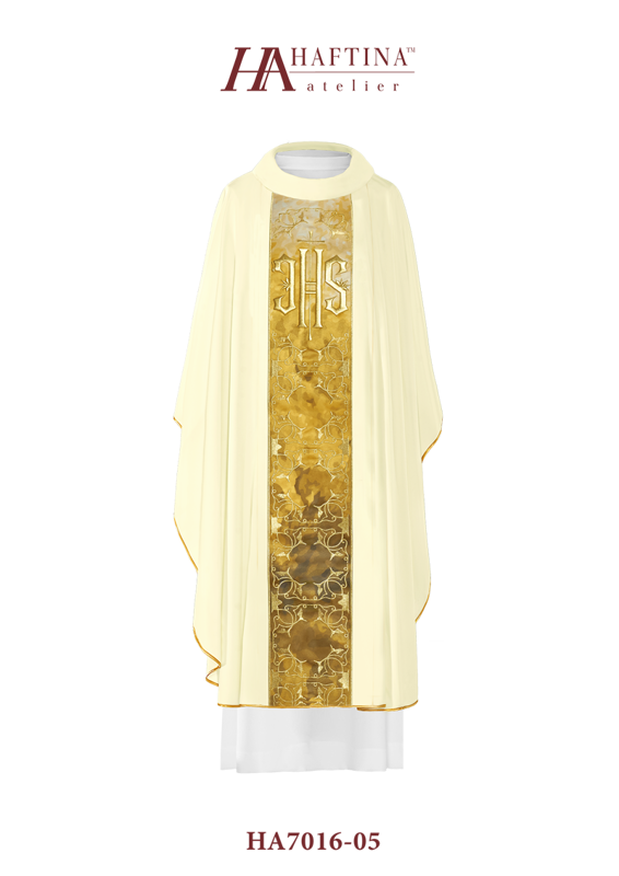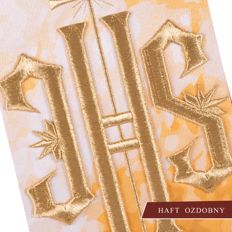 Ornat wykonany z wysokiej jakości tkaniny gładkiej, zdobiony sublimowanym pasem z haftowanym symbolem IHS. Całość wykończona złoto-satynową lamówką. Dostępny we wszystkich kolorach liturgicznych. Wykończenie kołnierza typu golf. Stuła wewnętrzna w komplecie.