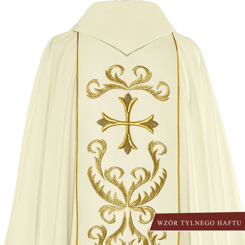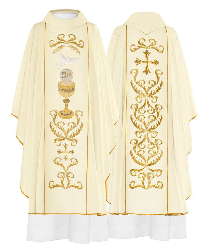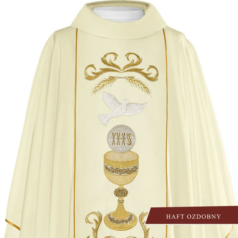 Ornat wykonany z wysokiej jakości tkaniny gładkiej, zdobiony pasem z haftowanym symbolem Gołębia, Kielicha IHS. Całość wykończona złoto-satynową lamówką. Dostępny we wszystkich kolorach liturgicznych.