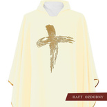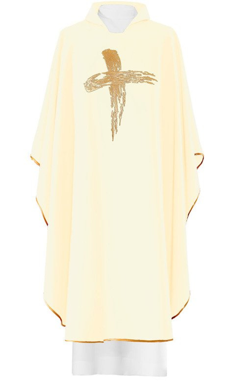 Ornat wykonany z wysokiej jakości tkaniny gładkiej, zdobiony haftowanym symbolem Krzyża. Całość wykończona złoto-satynową lamówką. Dostępny we wszystkich kolorach liturgicznych.